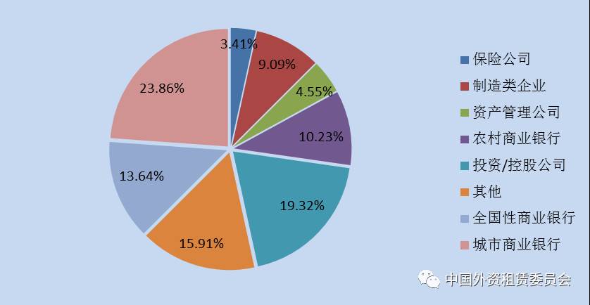 在所有金融租賃公司的控股股東和主要(前兩大)股東中,城市商業(yè)銀行占23.86%、全國性商業(yè)銀行占13.64%、農(nóng)村商業(yè)銀行占10.23%、投資/控股公司占19.32%。需要說明的是,該比例是按照股東的數(shù)量計算,并非按照投資金額的權重計算。