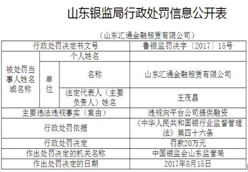 21日,山東銀監(jiān)局對(duì)山東匯通金融租賃有限公司(下稱“山東匯通金融租賃”)公布了行政處罰決定。