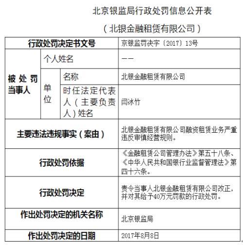 此前,北銀金融租賃因嚴(yán)重違反審慎經(jīng)營(yíng)規(guī)則,被北京銀監(jiān)局給予行政處罰,責(zé)令北銀金融租賃改正并罰款40萬(wàn)元。